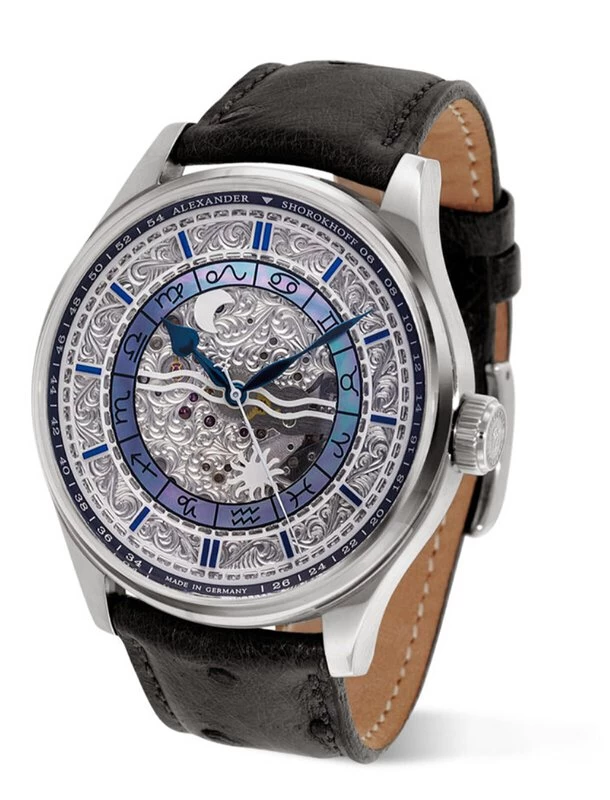 Diese kulturelle Faszination Babylons wird hier aufgegriffen. Die Platine des Werkes und der äußere Ring des Zifferblattes werden in einem hochkomplizierten Verfahren per Hand filigran ausgearbeitet und dekorativ gestaltet. Zusammen mit dem Stundenring aus dunkelblauem Perlmutt mit aufgedruckten Tierkreiszeichen, den gebläuten Zeigern und der Stundenmarkierung entsteht ein faszinierendes Bild. Auch auf der Rückseite der Uhr kann man sich an den meisterhaften Gravuren erfreuen.