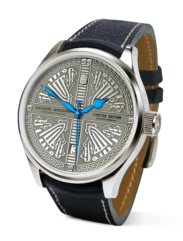 Die aus der arabischen Kalligraphie zusammengetragenen Ornamente präsentieren sich in einer neuen Interpretation. Das Zifferblatt ist in vier Sektoren unterteilt, umgeben von einem Mäander – ein Motiv aus der Kunst der griechischen Antike. In der Mitte befindet sich ein Kreuz, das an die frühere christliche Geschichte dieser modernen Metropole erinnert. Die Zeiger sind blau oder vergoldet, und die Stundenindexe bei 3, 6, 9 und 12 sind mit hochwertigen Diamanten verziert.