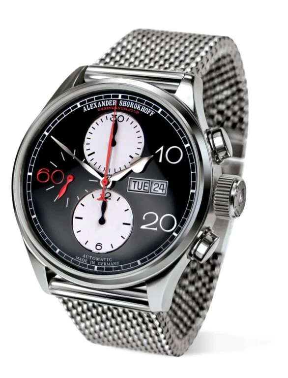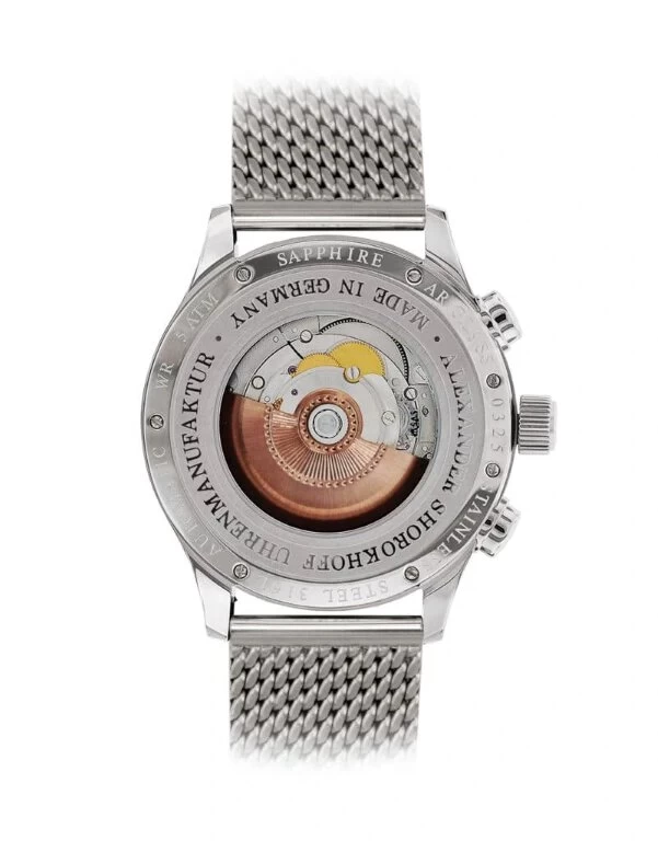 Die gebläuten und silberfarbenen Zeiger in der Formsprache des vergangenen Jahrhunderts und das konsequent modern gestaltete Zifferblatt ergeben ein genauso harmonisches wie avantgardistisches Gesamtbild.