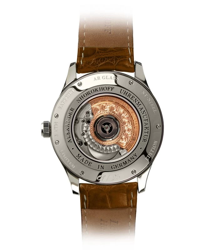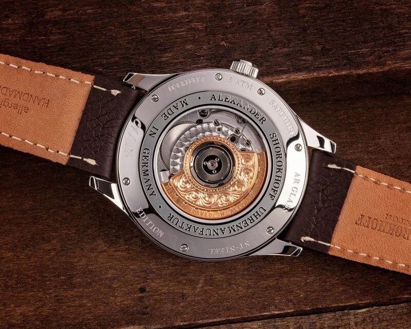 Der Rotor des Werkes wird, wie in der Alexander Shorokhoff Manufaktur üblich, handgraviert und in diesem Fall vergoldet; der Blick auf das beeindruckende Werk durch den Saphirglasboden lohnt sich. Das Gehäuse ist aus Edelstahl gefertigt, die Lünette und der Boden sind hochglanzpoliert, das Mittelteil – fein gebürstet. Das Frontglas ist entspiegelt.