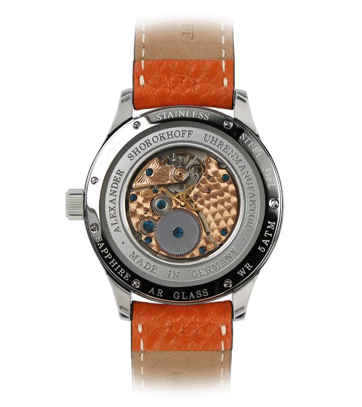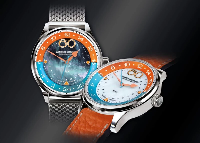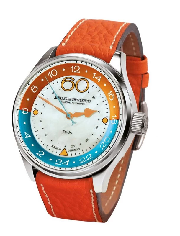 Ins Auge fallen ein leuchtendes Orange des oberen Ringes, das Hitze und Glut symbolisiert, und das warme Blau des unteren Ringes, das auf die lauen Äquatornächte anspielt. Beide umschließen – wie der Äquator – den Ozean, der im Zifferblatt mit schimmerndem hellem und dunklem Perlmutt angedeutet ist.