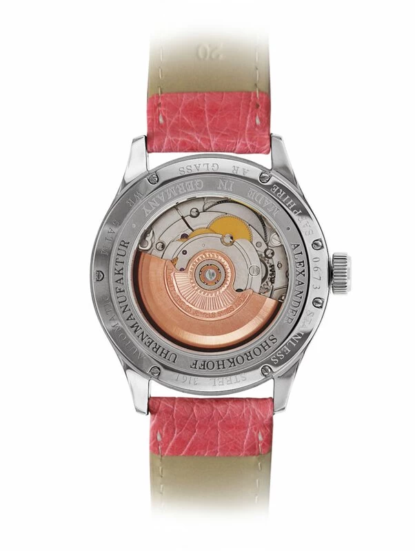 Das Zifferblatt der Damenuhr AS.LA01-25 weist ein natürliches Perlmutt-Rot auf, das eher in Richtung Rosa tendiert. Es ist ein Pastell-Rot und wirkt in dieser Ausführung besonders sanft und beruhigend. Die natürliche Farbe steht hier im Vordergrund – ohne Zusatzstoffe oder Verfärbungen. Sie wird lediglich mit den üblichen Elementen der „Avantgarde“-Linie, den großen Ziffern 20, 40 und 60, sowie den traditionellen Zeigern ergänzt. Um die Uhr farblich nicht zu überladen, hat man auch für das Band eine perfekt zum Zifferblatt passende Farbe ausgewählt.