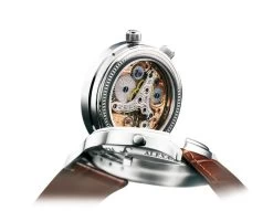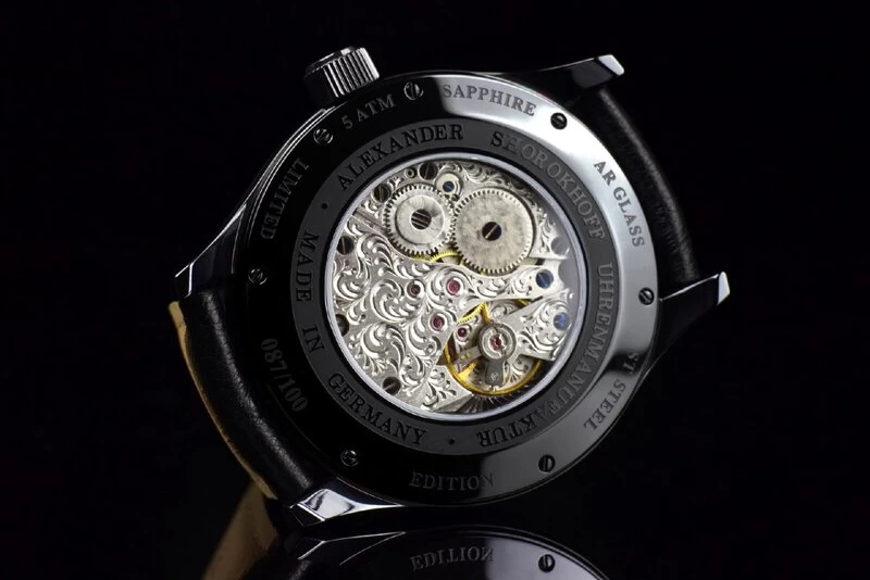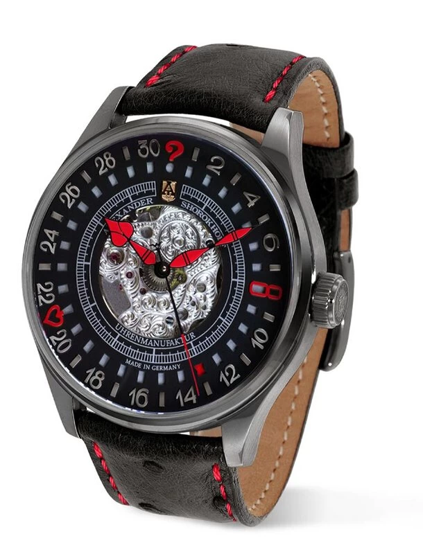 Die „Vintage“-Linie der Alexander Shorokhoff Uhrenmanufaktur wird mit einer neuen Auflage des Modells „Lucky 8“ vervollständigt. Die gesamte Darstellung der Uhr ist jetzt viel aufwändiger, denn sie wird durch filigrane, schwungvolle Handgravuren und Aussparungen unterstützt, durch die das Uhrwerk im offenen Zifferblatt sichtbar wird. Nicht nur die Platine, sondern auch das Datumsschaltrad wird handgraviert, während die drei Befestigungsschrauben für ein besseres Aussehen von Hand gebläut werden.