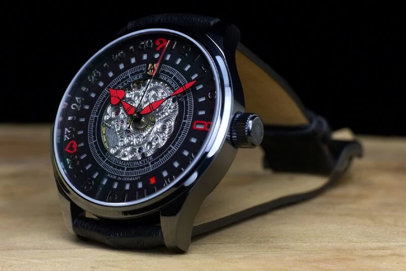 Kontrastierend zu den Farben schwarz, rot und silber kommt ein rotvergoldetes „Alexander Shorokhoff“-Logo hinzu. Das ist kein Fehler, sondern so beabsichtigt. Damit soll ein Zeichen gesetzt werden, um nochmals zu betonen, dass „Alexander-Shorokhoff“-Uhren anders sind und sich von den Uhren der anderen Mitbewerber abheben.