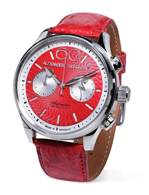 Ansonsten bietet der schöne Automatik-Chronograph die bekannten Merkmale der Avantgarde-Linie: die große Zahl 60, den silberfarbenen „Alexander Shorokhoff“ Schriftzug, der dieses Mal als Applikation dargestellt wurde und eine Druckfestigkeit bis 5 bar. Das 43,5 Millimeter große und 14,4 Millimeter hohe Edelstahlgehäuse beherbergt das handgravierte und veredelte Kaliber 2030.AS (Basis 2030 DubouisDepraz) mit einem handgravierten und veredelten Rotor und bietet wie immer eine Stopp- und Summierfunktion bei 9 Uhr an.