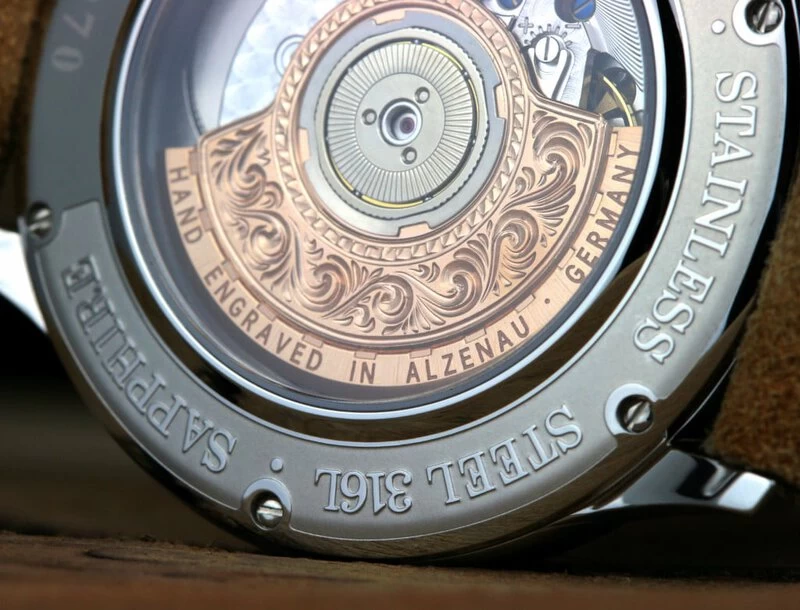 Der Rotor des Schweizer Werks 2892.AS wurde im speziellen “Alexander Shorokhoff”-Stil graviert und veredelt