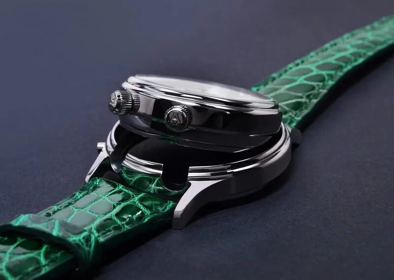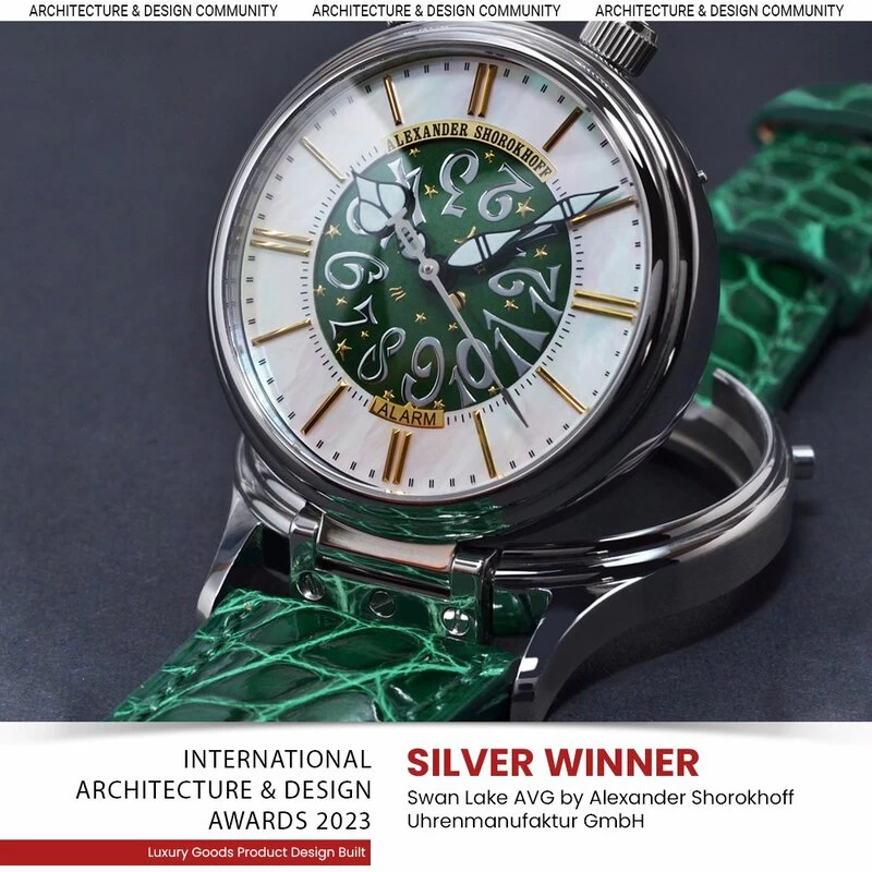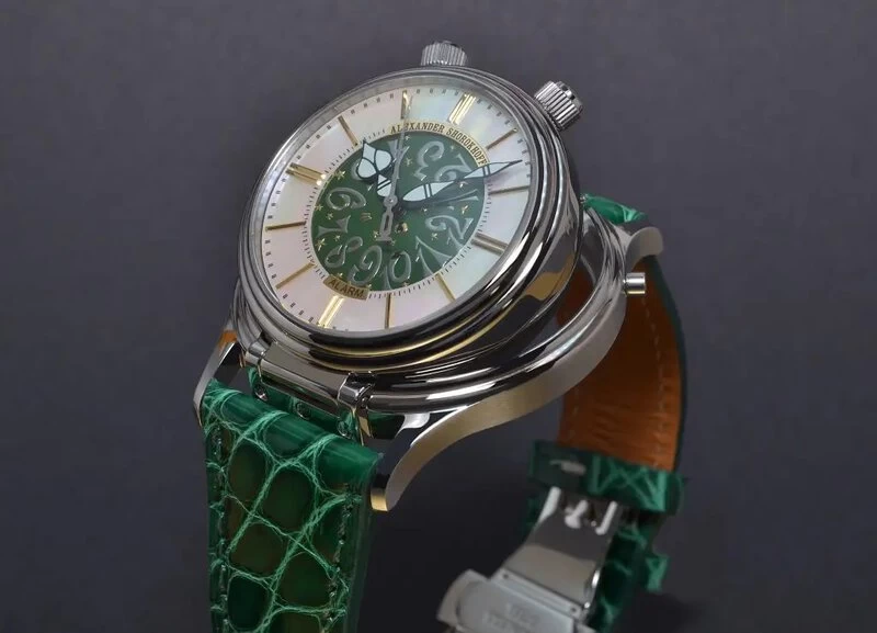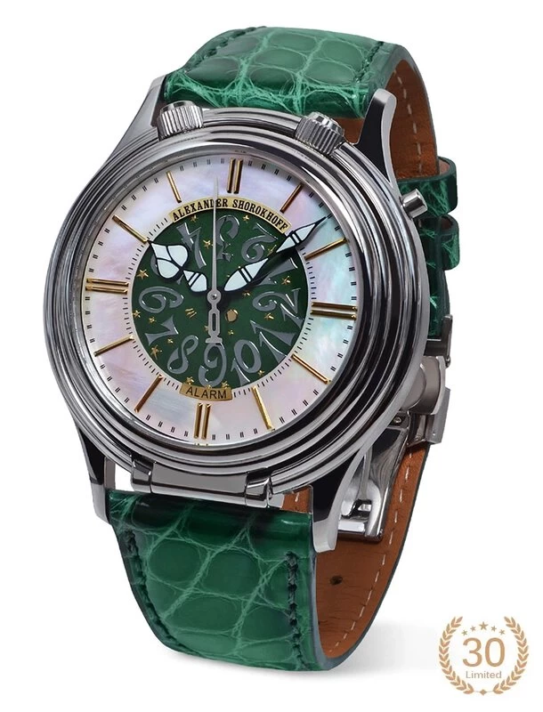 Die Zifferblätter sind in verschiedenen Ausführungen erhältlich. Der äußere Bereich des Zifferblatts der grünen Variante verkörpert mit einem hellen Perlmutt die Weichheit der Uhr, die innere Weckscheibe erstrahlt in einem satten Grün. Weitere Farben in Blau und Rot werden folgen. Die Stunden- und Minutenzeiger wurden im üblichen „Alexander Shorokhoff“-Stil mit Leuchtmasse gestaltet, um auch in der Nacht die Uhrzeit gut ablesen zu können. Die vergoldeten Stundenappliken unterstreichen die glanzvolle Uhr.