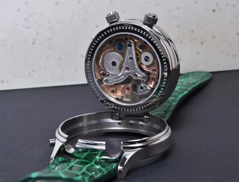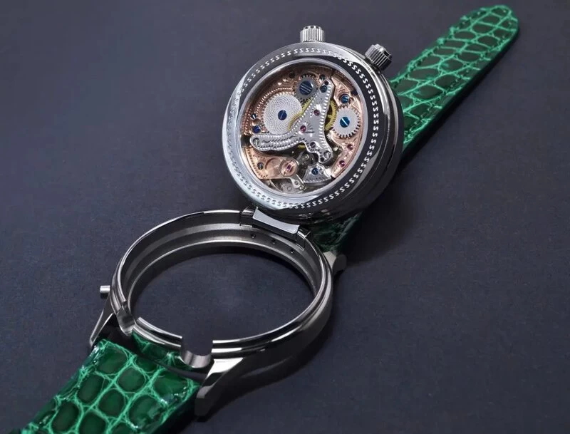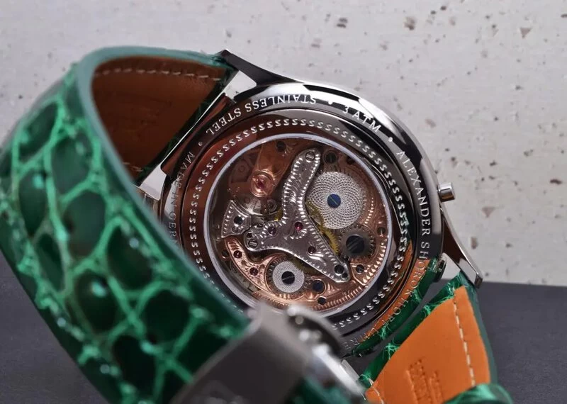 Die Graveure der „Alexander Shorokhoff”- Uhrenmanufaktur haben aber auch bei der Veredelung des Werkes ganze Arbeit geleistet. Das Uhrwerk wurde phantasievoll graviert und wertvoll veredelt. Traditionell gravierte Motive der Brücken, sowie die Guillochierung der Rädchen schaffen ein nostalgisches Gefühl. Nach dem Gravieren und Polieren werden alle Brücken vergoldet oder rhodiniert sowie die Schrauben gebläut, um dem Werk eine besonders schöne Optik zu verleihen. Nach und nach entsteht ein fantastisches kleines Kunstwerk, welches man durch einen Saphirglasboden in seiner ganzen Schönheit bewundern kann.