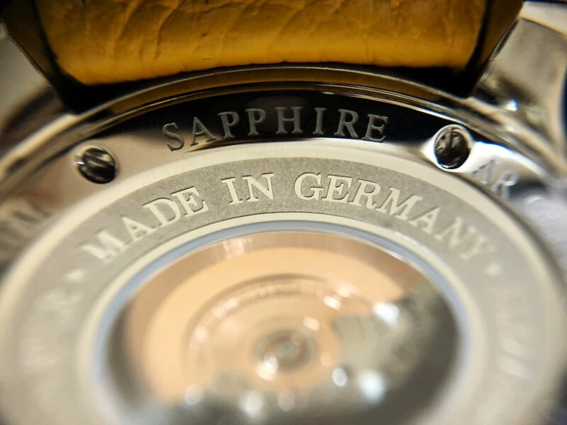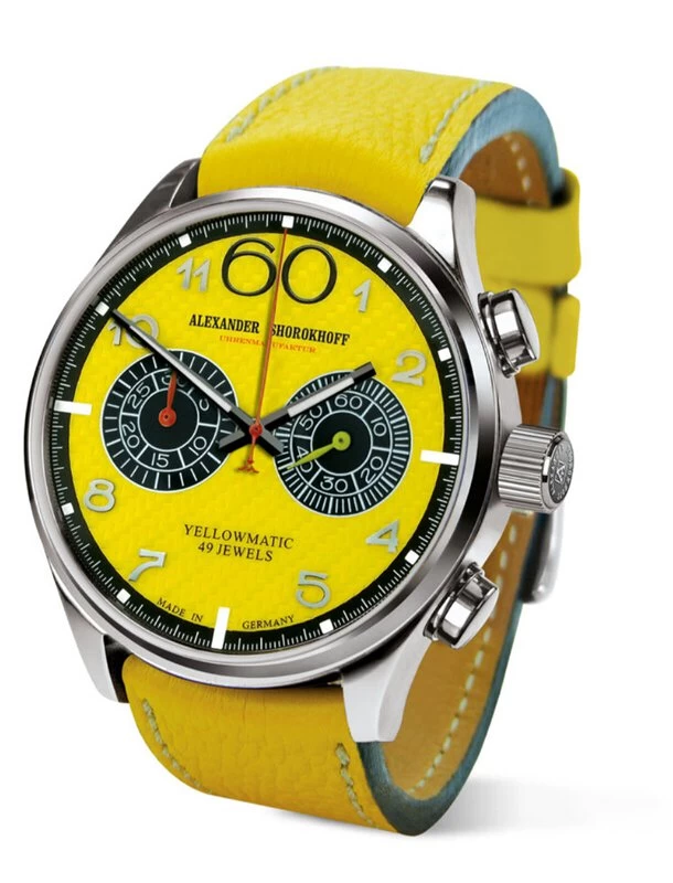 Das automatische Chronowerk der Yellowmatic wird von den Uhrmachermeistern der Alexander Shorokhoff Uhrenmanufaktur nach ästhetischen Gesichtspunkten präzise überarbeitet. Der Rotor wird handgraviert und veredelt. Der Saphirglasboden erlaubt den Blick auf das fein veredelte Werk.