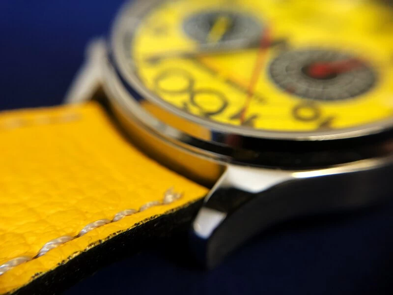Das leuchtend gelb emaillierte Zifferblatt mit der ausgefallenen Guillochierung bildet die Basis für die Zahlen und Formen, die auf außergewöhnliche Art und Weise platziert wurden. Die schwarzen Zahlen, wie auch die schwarzen Sekunden- und Minutenkreise bei „3“ und „9“ Uhr, fallen auf dem gelb emaillierten Zifferblatt sofort ins Auge.