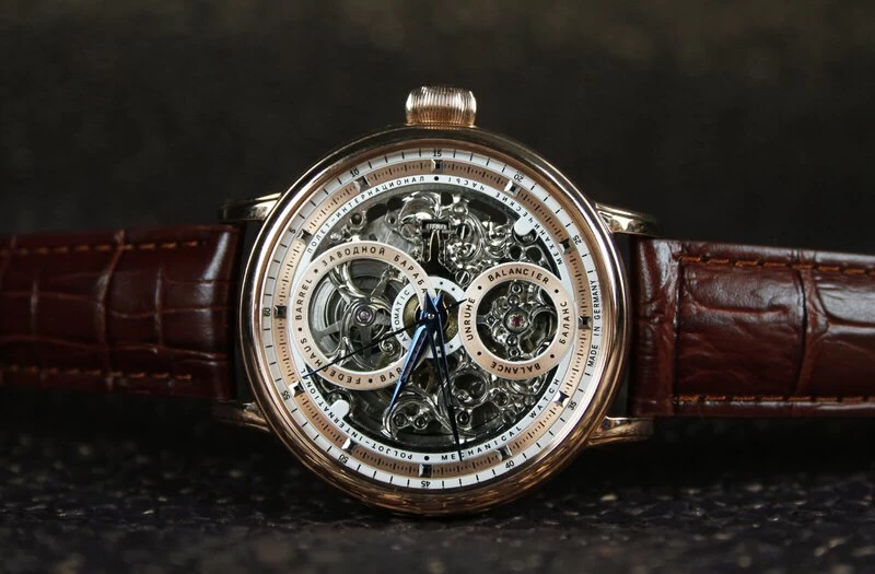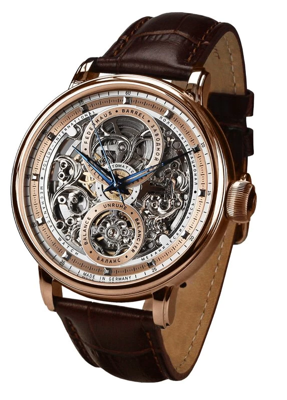 Das erste automatische Skeleton “Hermitage” ist von diesen Kunstwerken inspiriert – klassisch und künstlerisch skelettiert. Im Bereich der beiden Ringe können die Unruh und das Federhaus, welche durch skelettierte Rotoren komplementiert werden, sehr gut gesehen werden.
