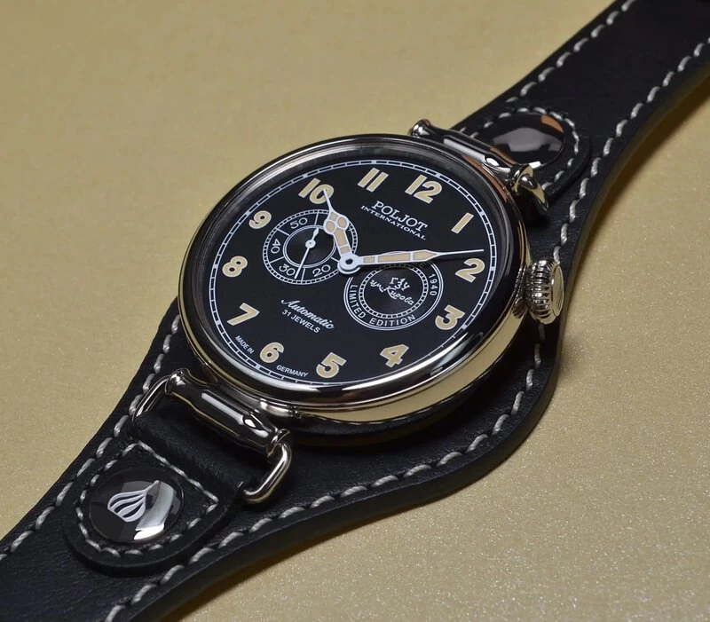 Die Anstöße für das Armband wurden ebenfalls dem Original nachempfunden, aber auch hier wurden technische Modernisierungen vorgenommen. Um das Band wechseln zu können, muss nur eine Schraube im vorderen Teil der Bandanstöße gelöst werden. Das Armband ist so geblieben, wie es in den 40er Jahren war. Es ist mit zwei Stahlknöpfen sowie dem Logo der Marke “Poljot-International” verziert. Was dieses Modell auszeichnet und definitiv von seinen Vorgängern unterscheidet, ist die außergewöhnlich gewählte Farbe des Lederbandes. Das weiße Kalbslederarmband mit Nieten und blauen Akzenten ist besonders frisch am Handgelenk anzusehen.