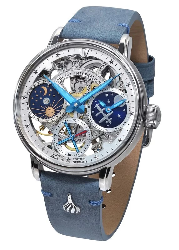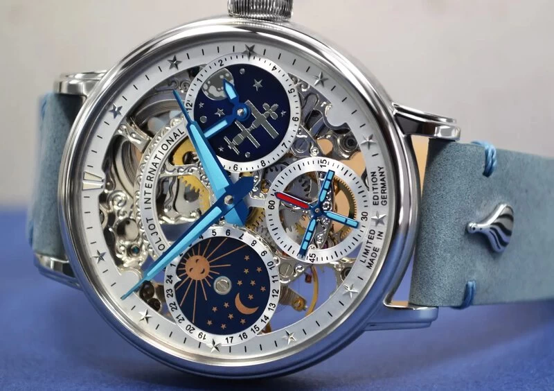 Beim Blick auf das Zifferblatt fällt sofort die zweite Zeitzone bei 3 Uhr auf, die die ISS-Raumstation und die Erde darstellt. Auch der Sekundenzeiger auf der 6-Uhr-Position ist symbolisch als kleine Raumstation gestaltet. Die rote Markierung erleichtern das Ablesen der Sekunden. Die Stundenmarkierungen im äußeren Bereich des Zifferblatts sind in Form von kleinen Sternen platziert, was das Thema Weltraum noch einmal aufgreift. Im 9-Uhr-Bereich befindet sich außerdem eine Tag- und Nachtanzeige. Alle blau beschichteten Zeiger sind ebenfalls mit blauer Leuchtfarbe versehen, um eine gute Ablesbarkeit der Zeit auch im Dunkeln zu gewährleisten.
