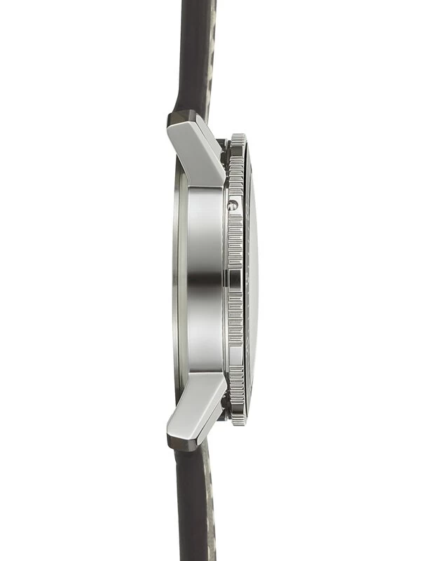 Das Deckglas besteht aus Saphirkristall, welches wir auch für den Sichtboden einsetzen. Der Fliegerdrehring ist beidseitig drehbar und rastet in Minutenschritten. Er ist unverlierbar mit dem Gehäuse aus poliertem Edelstahl verbunden und trägt als Hauptmarkierung ein nachleuchtendes Dreieck.