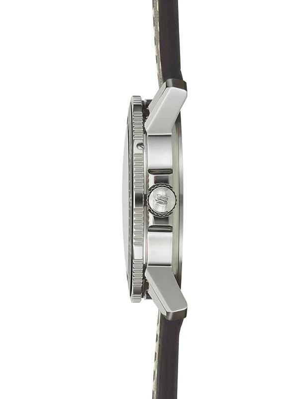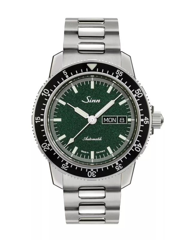 Als farbliche Besonderheit haben wir für dieses Modell ein metallisch grün schimmerndes Zifferblatt gewählt. Ausgestattet ist die instrumentelle Uhr mit einem polierten Gehäuse aus Edelstahl. Deck- und Bodenglas bestehen aus Saphirkristall, sodass sich die präzise Arbeit des mechanischen Werkes genauestens beobachten lässt. Der beidseitig drehbare, in Minutenschritten rastende Fliegerdrehring ist unverlierbar mit dem Gehäuse verbunden. Als Hauptmarkierung trägt er ein nachleuchtendes Dreieck.