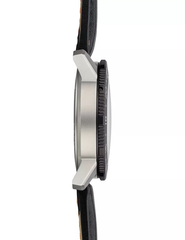 Der Drehring selbst ist unverlierbar mit dem perlgestrahlten Gehäuse verbunden. Seine schwarze Hartstoffbeschichtung auf tegimentiertem Untergrund verleiht der Uhr in ihrer Gesamtheit ein professionelles Erscheinungsbild.