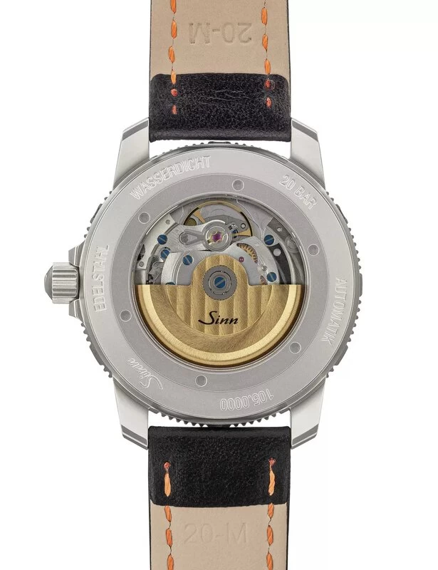 Das Zifferblatt ist mattschwarz mit orangefarbenen Akzenten. Bei der Tag- und Datumsanzeige lässt sich der Wochentag in englischer oder deutscher Sprache einstellen. Und jenseits aller präzisen Zeitmessung können Sie durch den Glasboden aus Saphirkristall die Feinheiten des mechanischen Uhrwerks detailliert beobachten.