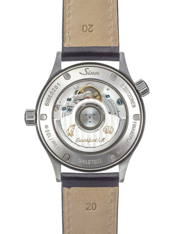 Die Frankfurter Finanzplatzuhr Modell 6068 bildet eine gelungene Verbindung aus Ästhetik und Funktionalität, die durch Klarheit und Übersichtlichkeit besticht. Damit reiht sich diese Uhr nahtlos ein in die beliebte Modellreihe, die seit ihrer Präsentation im Jahre 1999 auch über die Stadtgrenzen hinaus viele Uhrenfreunde gefunden hat. Mit ihren Ausstattungsmerkmalen knüpft sie an bewährte technische Details der Modellreihe an. So ermöglicht das Modell 6068 die Anzeige von zwei Zeitzonen auf 12-Stunden-Basis. Das Gehäuse besteht aus poliertem Edelstahl und fasst das schwarze Zifferblatt mit Sonnenschliff ein. Die aufgesetzten Appliken sind mit Leuchtfarbe belegt, ebenso Stunden- und Minutenzeiger. Das Deckglas besteht aus beidseitig entspiegeltem Saphirkristall. Durch den Sichtboden aus innen entspiegeltem Saphirkristallglas lässt sich das veredelte Uhrwerk mit der Rotorgravur „Bulle und Bär“ betrachten. Die 6068 ist zudem wasserfest bis 10 bar und unterdrucksicher.