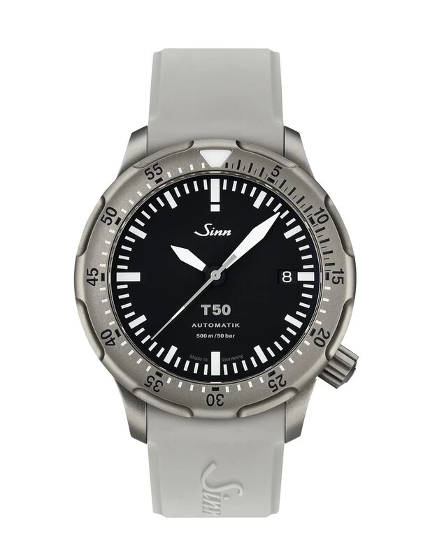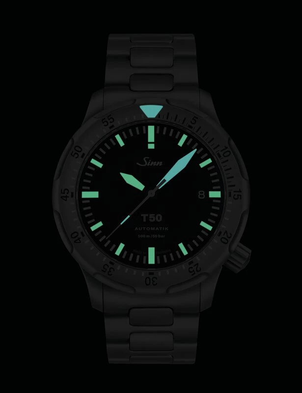 Klare Ablesbarkeit und Messbarkeit der Zeit beherzigt die T50 kompromisslos – durch eine auf das Wesentliche reduzierte Anzeigenform und markant-großflächige Schwertzeiger. Zusätzlich sind alle für den eigentlichen Tauchgang irrelevanten Funktionen und Bedruckungen von Zifferblatt und Sicherheitsdrehring optisch zurückgenommen. Zum sicheren Ablesen insbesondere der Merkzeiten auch bei Dunkelheit oder widrigen Sichtverhältnissen setzt der Zeitmesser auf eine Farbcodierung: Stundenzeiger und Indizes des Zifferblatts leuchten grünlich nach, Minutenzeiger und Sekundenzeiger sowie Hauptmarkierung des Drehrings bläulich.
